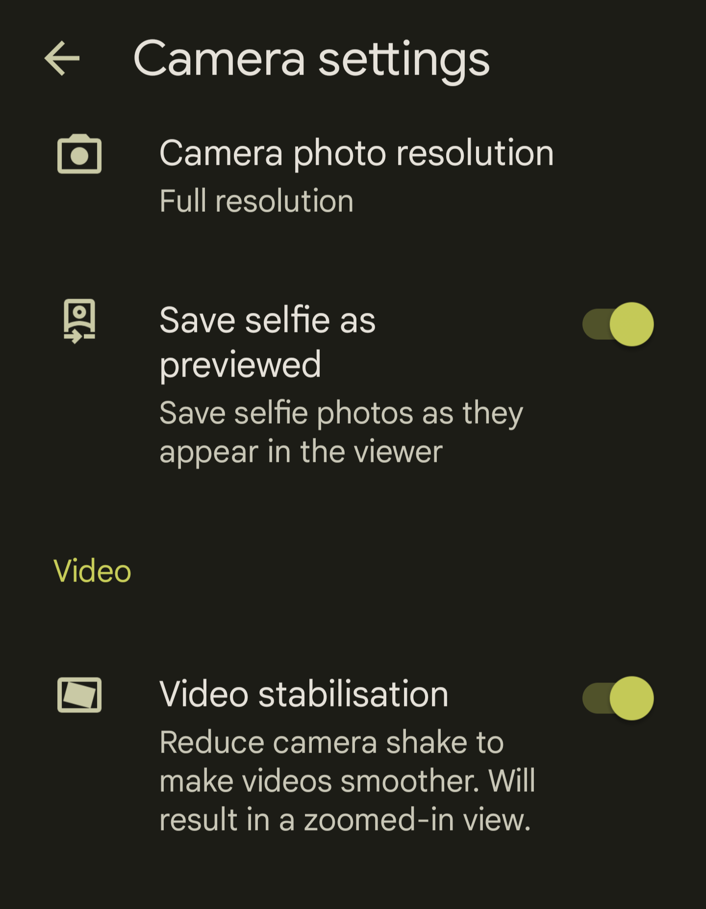 Here is a screenshot of setting available in the camera app on Pixel.