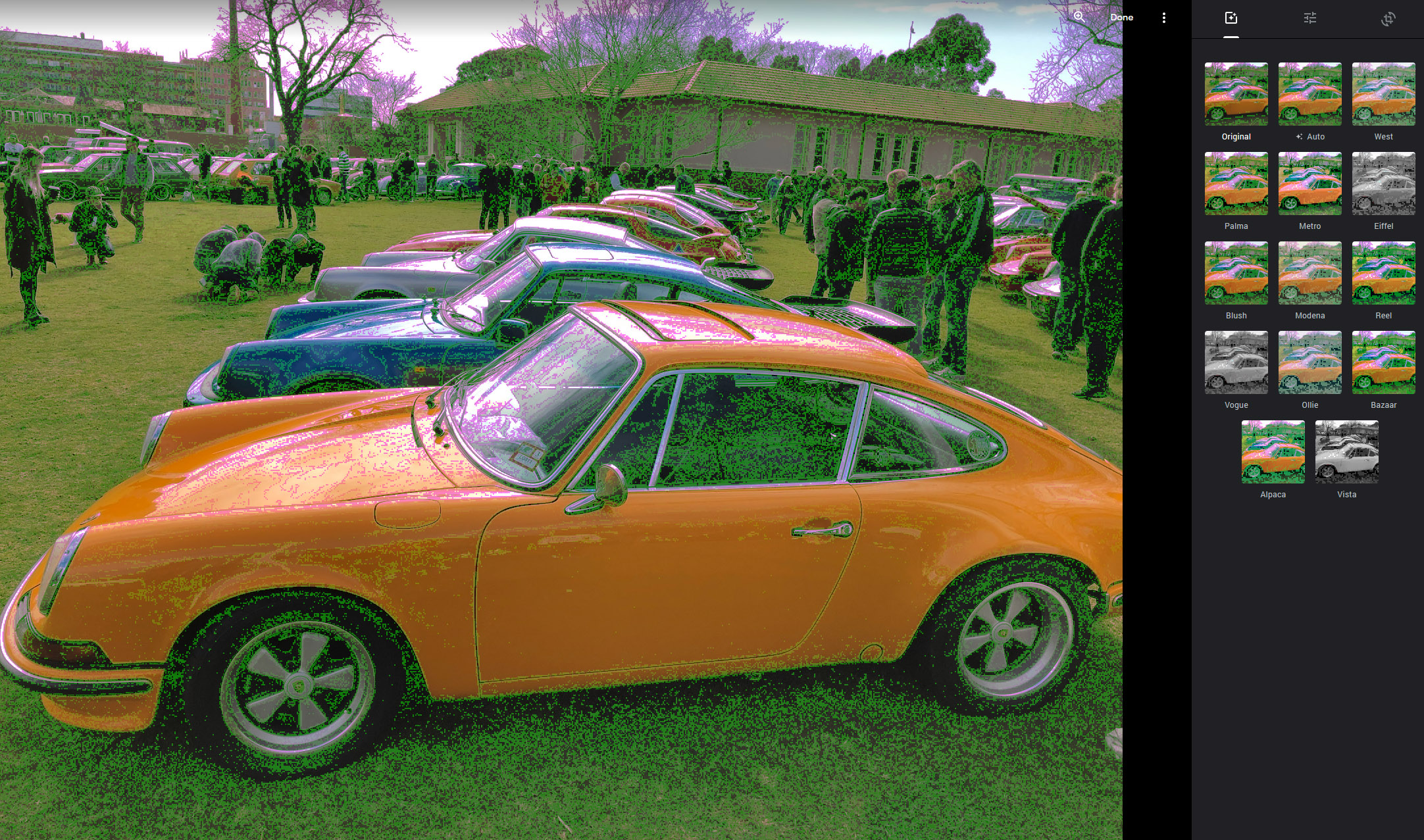 I have had issues with editing photos on Google Photos for probably a year now. I get all these green dots appear after pressing Edit and side window showing filters appears. See attached.