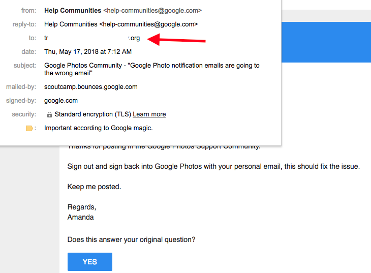 Question: Google Photo notification emails are going to the wrong email
