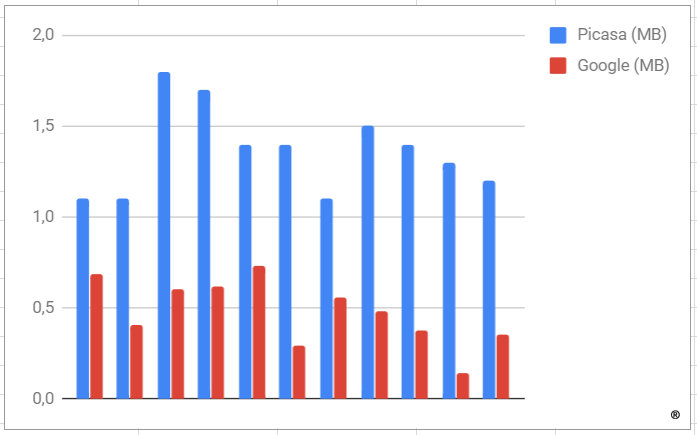 For example: I just saw an example from a modern 24 MP Samsung smartphone with produces files around 8 MB. But uploading in HQ-mode downsizes to 16 MP and further jpg-compression downsized to 0,5 MB. But the same owner did not share an album with at least 10 quite different pictures with me, so I even can't do any averaging. Because then I would have found something like 2 MB and that feels better :-)