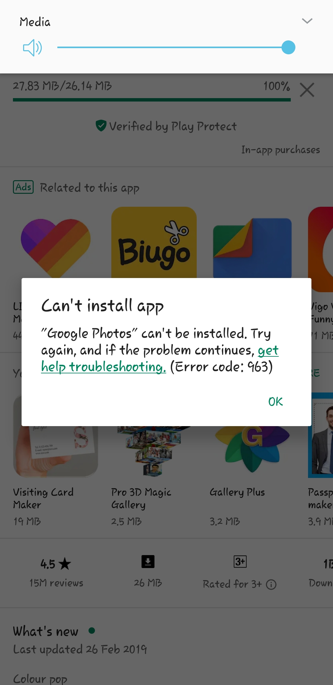Why the hell I'm not able to install Google photos As it's get download The Error come on the screen can't install ( Error code 963) What is this and why I'm getting this error....Plz let me know.