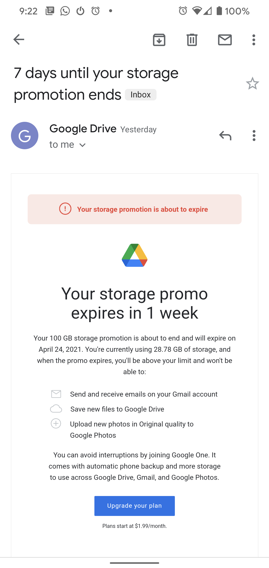 I have a Pixel that says anything I upload from my phone has free and unlimited space. Now I get an email that says my "promotional storage" is over the limit and I'm going to be cut off from sending and receiving emails.....???