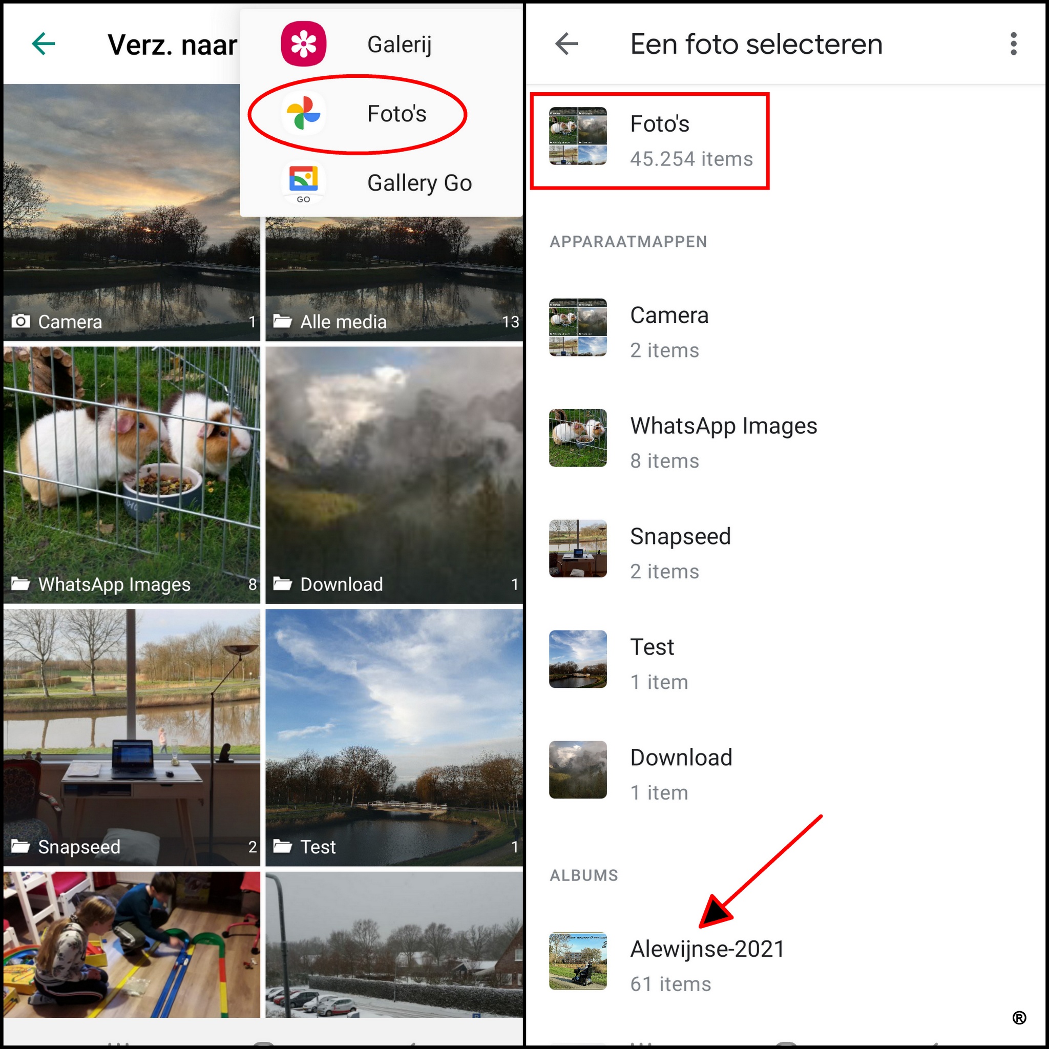 In WA you can hit the paperclip to get into WA's own gallery, but if you hit the 3 dots right-up, you may have direct access to Google Photos and even to your albums on Google Photos.