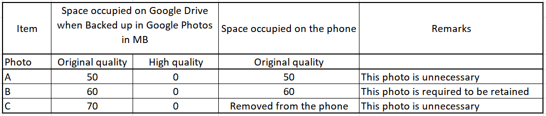 In this way, by removing "A" and "C" from Google Photos (which are in original quality) and after removing from the trash or bin, you stand to get 120 MB space released on Google Drive.