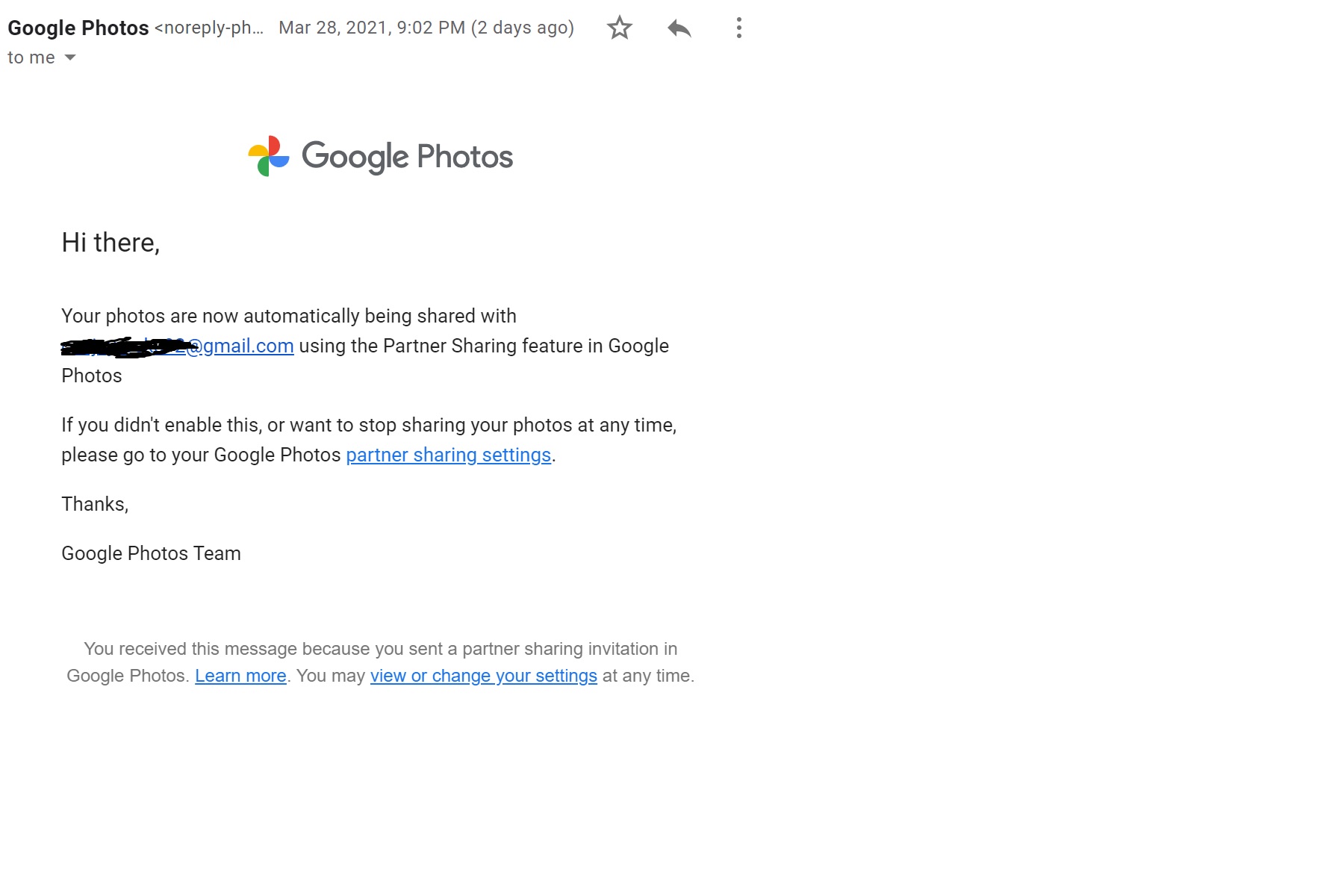 I received an email in the middle of the night notifying that an user was added to my Partner Sharing settings. This email was an automatically generated one from Google Photos. However, I never added this user. I have since changed all of my passwords to protect myself from further hacks. It's perplexing how this would have happened, as my Google Account showed no recent login activities from anyone in the past 28 days. The only activities shown are the logins I performed recently to change my password.