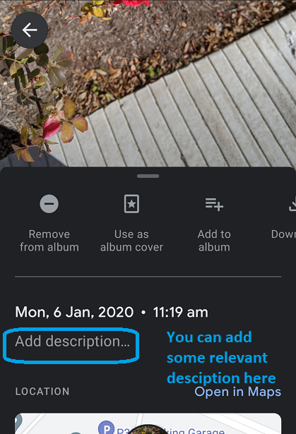 Nevertheless, you can use another feature in the Google Photos app. You can add description (Also called as caption).