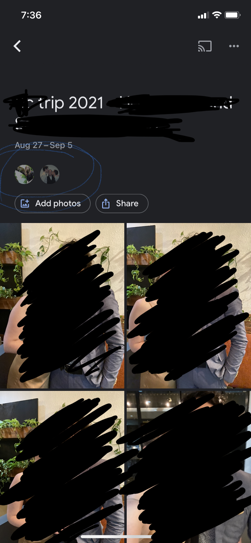 I have already logged out and back in, deleted and reinstalled the app, and tried to make about 6 different album. All the photos I am using are backed up, so I am really at a loss here. I attached a schreenshot of the greyed out bubble of people it's shared with, Please help!